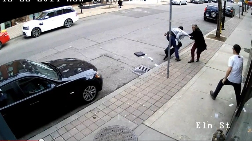 Durante el forcejeo, el maletín cae al suelo y se esparcen unos billetes por la calzada.