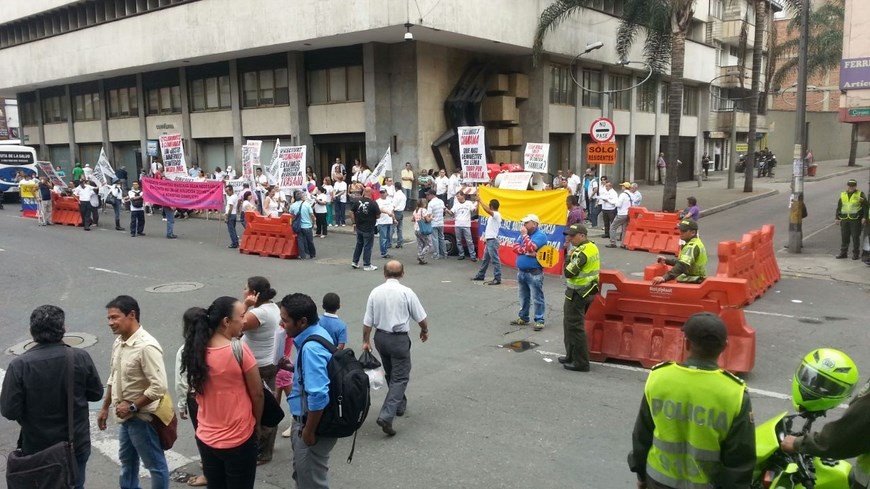 Con pancartas y arengas, los asistentes al plantón solicitaron, entre otras cosas, el pago de una liquidación que se considere “justa y acorde con las leyes colombianas”.