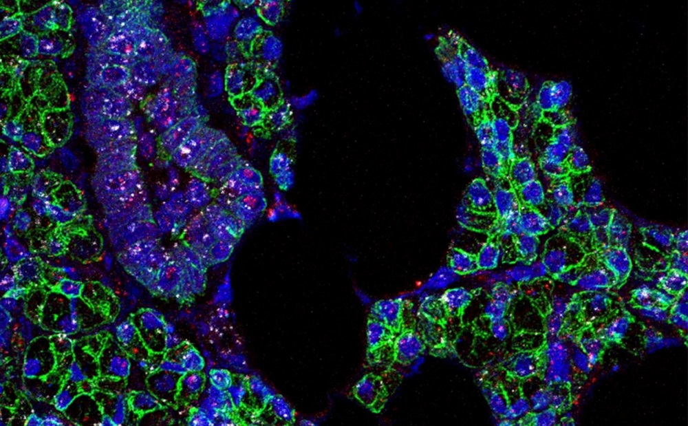 El ARN del SARS-CoV-2 (rosa) y del receptor ACE2 (blanco) encontrados en las células de las glándulas salivales humanas, que se han señalado en verde. EFE/Paola Perez/Instituto Nacional de Investigación Dental y Craneofacial.