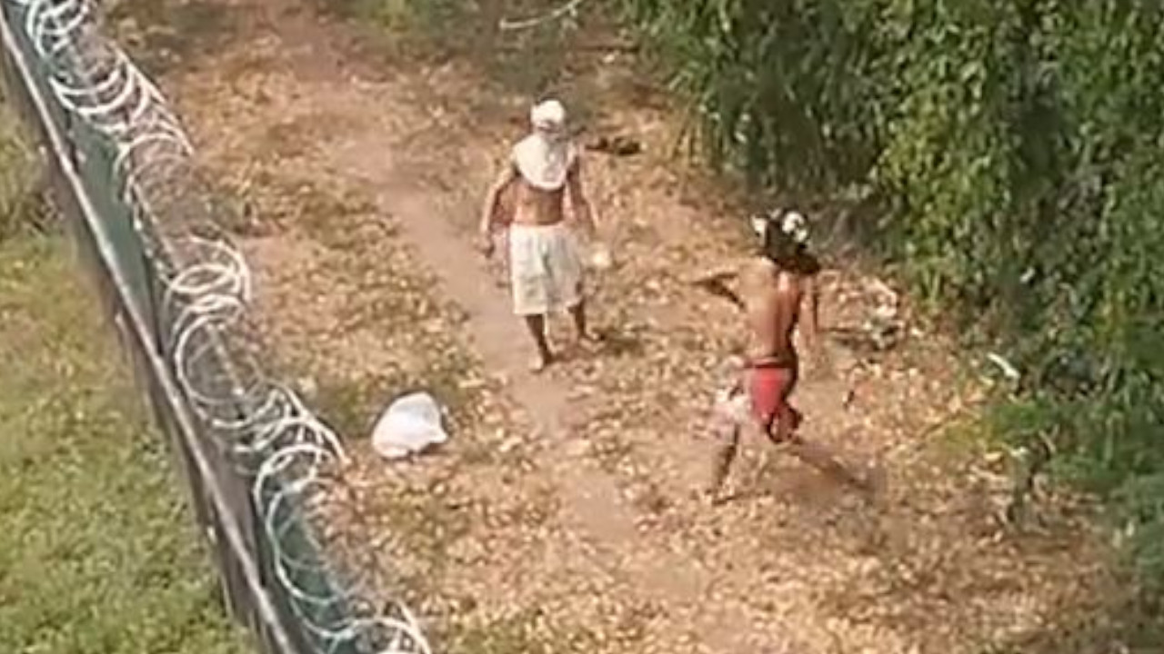 Una vez culminada la tarea, ambos hombres corren, con sus pies descalzos, por un camino que bordea el centro penitenciario.