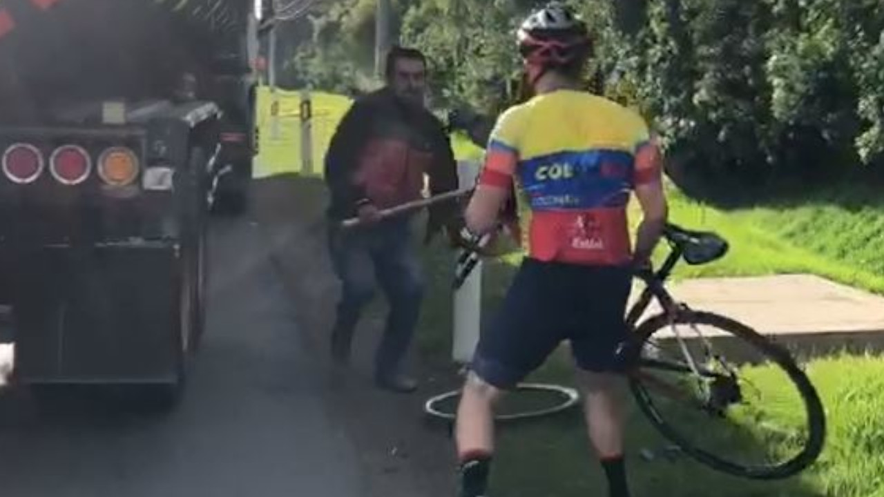 Mientras el camionero le lanzaba palazos al ciclista, un hombre, al aparecer también ciclista, grababa y le pedía al conductor que parara su violenta acción.