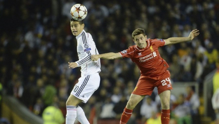 James Rodríguez (i) lucha por el balón con Joe Allen (d) del Liverpool durante el partido de Liga de Campeones. EFE/Archivo