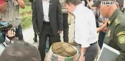 El presidente de Colombia, Juan Manuel Santos, de nuevo olió una paca incautada de marihuana, esta vez en en la Comuna 13 en Medellín.