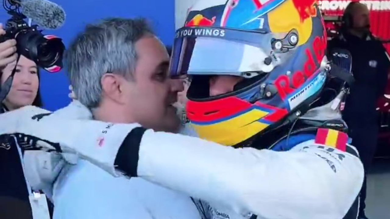 Juan Pablo Montoya y su hijo Sebastián, piloto de la Fórmula 3, protagonizaron un bello abrazo en el Gran Premio de Bélgica de Fórmula 3. Foto: tomada de video de X @diegofmejia