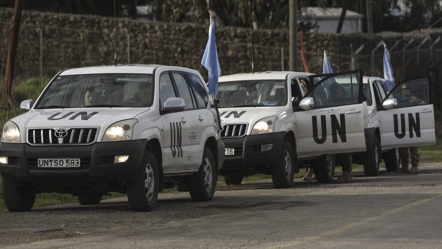 Soldados de la misión de paz de la ONU en los Altos del Golán (UNDOF) esperan para cruzar el paso de Quneitra, en la frontera entre Israel y Siria. EFE/Archivo