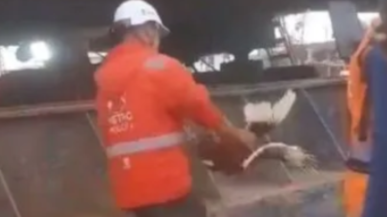 Uno de los trabajadores toma el animal con las manos y lo lleva junto a la obra, momento seguido en que toma un arma blanca con la que le corta el cuello al gallo.