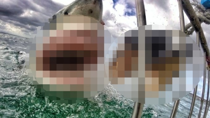 La fotografía, como puede verse, muestra a un tiburón blanco enfurecido con la mandíbula abierta lanzándose sobre dos peces atados a una cuerda.