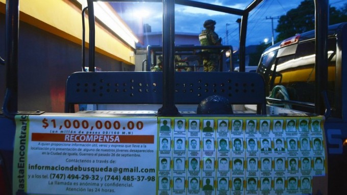 Retratos junto a la cifra de un millón de pesos ofrecida a cambio de pistas por el gobernador del Estado, Ángel Aguirre, otro de los grandes perjudicados por este caso que ha conmocionado a la sociedad mexicana, por lo evidente de la mezcla entre autoridades y narcotráfico.