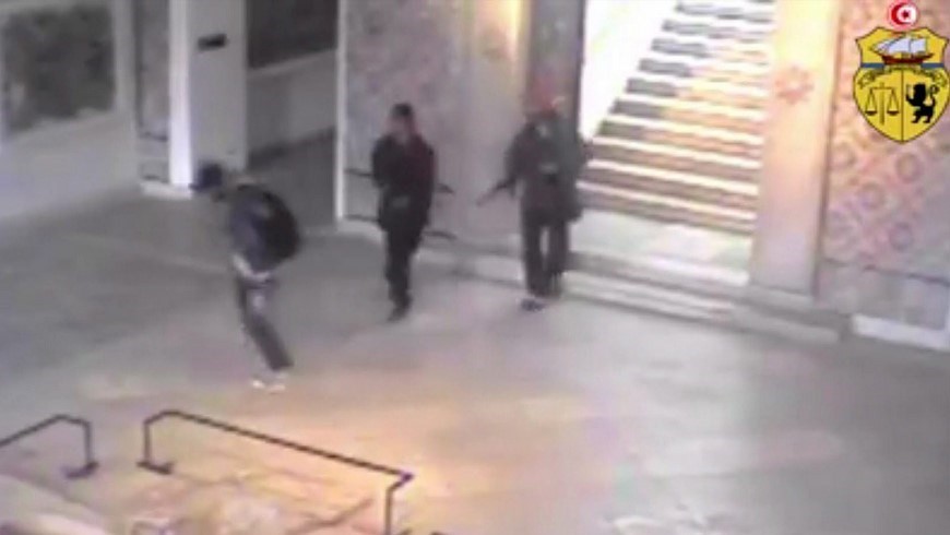 Fotografía facilitada hoy por el Ministerio de Interior tunecino que muestra a dos hombres armados caminando por el Museo del Bardo, en Túnez, el pasadol 18 de marzo durante el ataque en el que murieron 25 personas. EFE