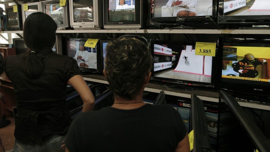 Clientes de un almacén de electrodomésticos observan una exhibición de televisores, en Caracas (Venezuela). EFE/Archivo