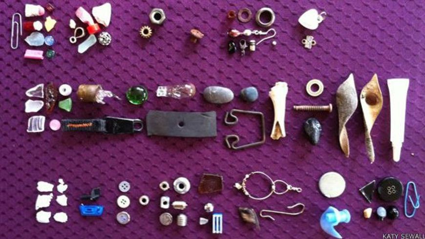 Una diminuta bola plateada, un botón negro, un clip azul para papel, una cuerda amarilla, un pedazo desteñido de espuma, una pieza de Lego azul… La lista de “regalos” es interminable.