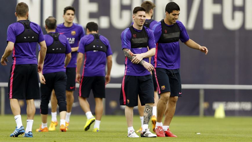 El delantero argentino del Barcelona Lionel Messi (2d) y el uruguayo Luis Suárez (d), en un momento del entrenamiento de su equipo en la ciudad deportiva Joan Gamper, en la víspera del partido de liga que les enfrenta mañana al Córdoba. EFE