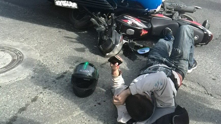 Por el impacto, la moto quedó debajo de una de las esquinas delanteras del bus, contra una llanta, y el motociclista, tendido en la calle.