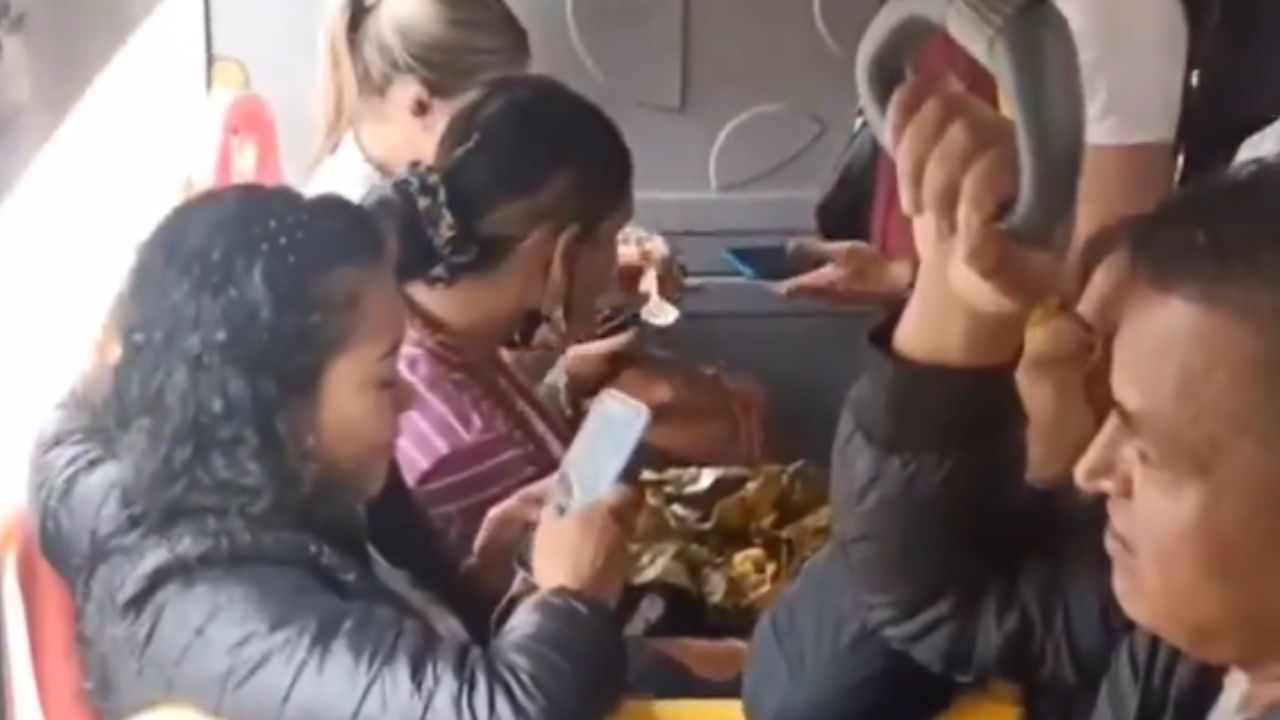 En la grabación, se puede ver a la pasajera sentada en el primer vagón del bus, comiendo su tamal, sin preocuparse por la multitud que la rodea.