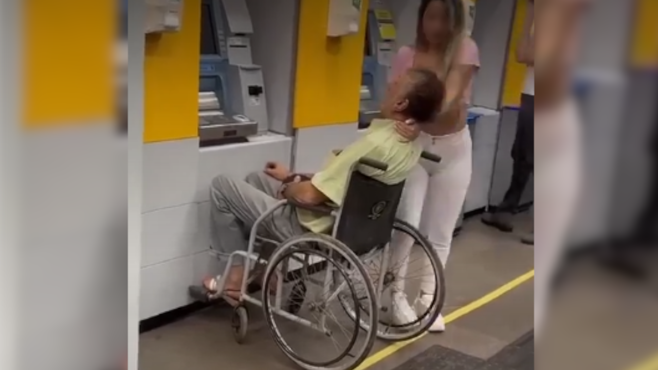 Una mujer fue captada llevando a un adulto mayor, presuntamente su pareja sentimental, a retirar el dinero en Brasil.