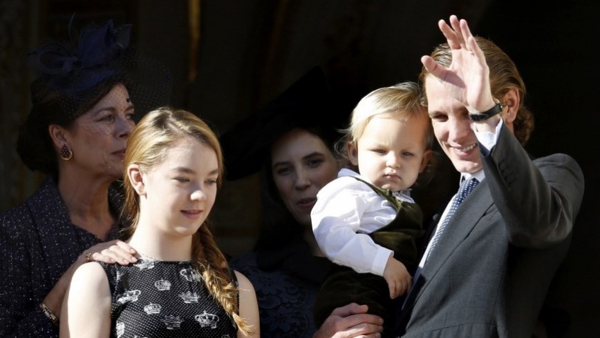 ndrea Casiraghi (d) sostiene a su hijo Alexandre "Sacha" Casiraghi en brazos, en presencia de su madre, Carolina de Mónaco (i), de su hermanastra Alexandra (2i) y de su esposa, Tatiana Santo Domingo (c), en el balcón del Palacio de Mónaco. EFE/Archivo