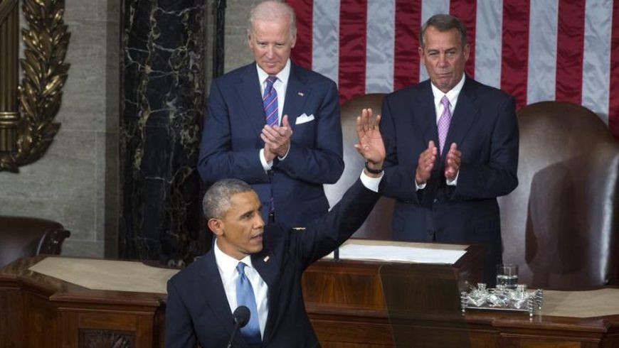 El presidente estadounidense, Barack Obama, acompañado del vicepresidente Joseph Biden (i) y del presidente de la Cámara de Representantes, John Boehner (d), presenta su discurso sobre el Estado de la Unión en la Cámara de Representantes de los Estados Unidos en el Capitolio en Washington (EE.UU.). EFE