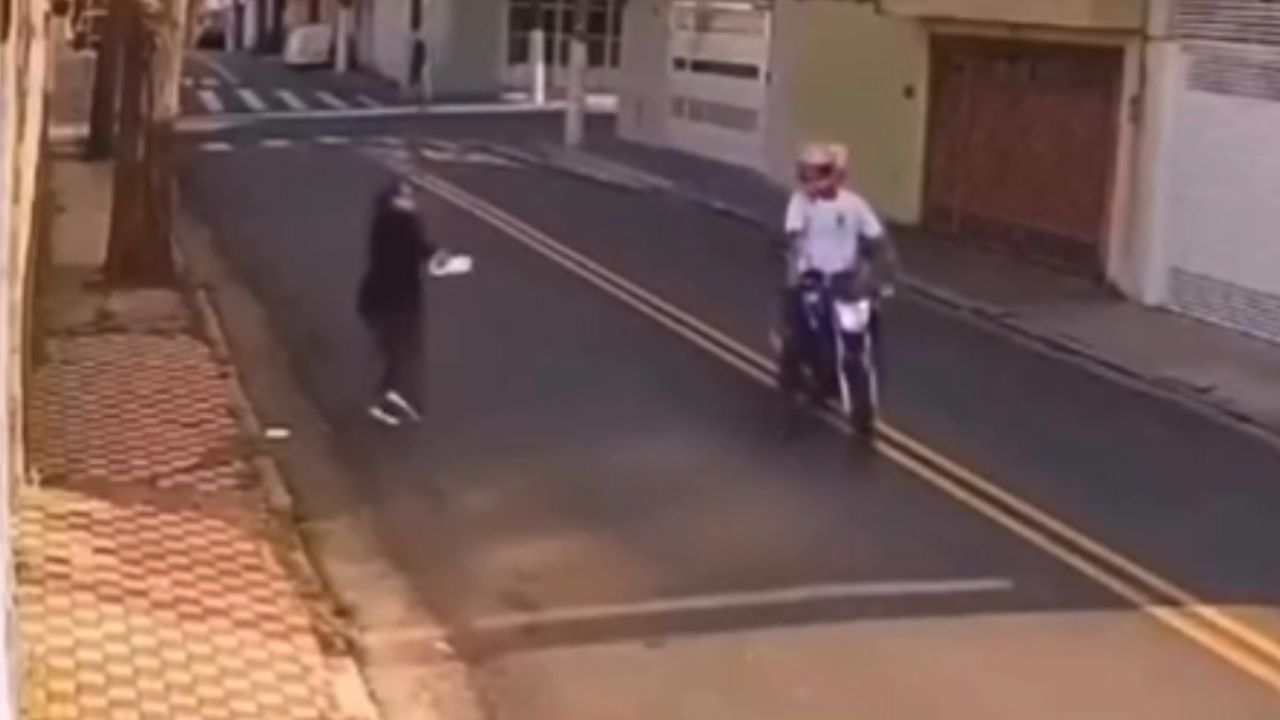 Resulta que la mujer se pensó que el motociclista iba a robarle. Tremendo susto se llevó esta señora.