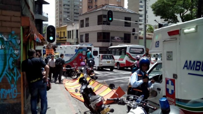Minuto30.com-. Por heridas leves, el personal del sistema de emergencias de Medellín atendió a tres personas a las que les cayó el parasol de una panadería cuando, en sus motos, se movilizaban por el parque de El Periodista.