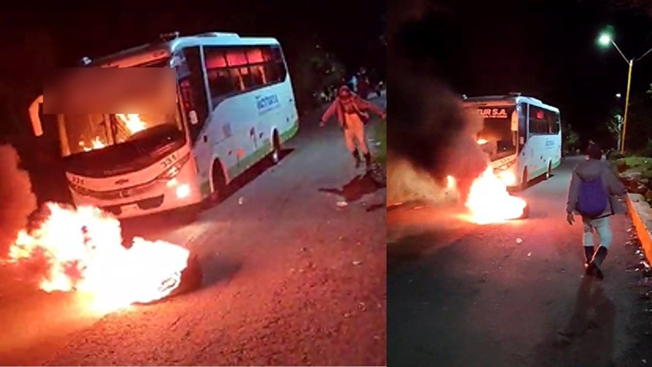 En un video que circula en redes sociales, se ven hombres que habrían incinerado un bus en la mitad de la vía, así como llantas.