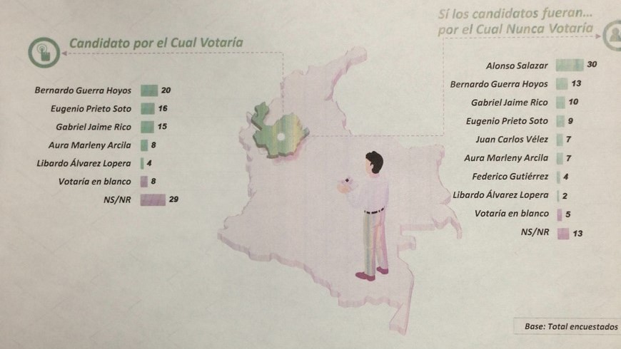 1. “Candidato por el cual votaría: Bernardo Alejandro Guerra 20%, Eugenio Prieto 16%, Gabriel Jaime Rico 15%, Aura Marleny Arcila 8% y Libardo Álvarez Lopera 4%, voto en blanco 8% y NS/NR 29%”.