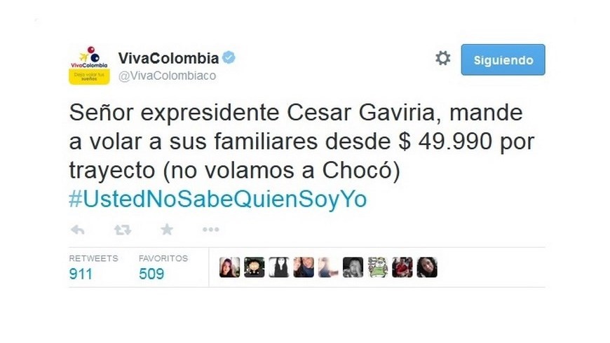 Minuto30.com-. Comentarios a favor y en contra ha recibido la aerolínea VivaColombia por cuenta de un tuit en el que aprovechó la frase de moda “¿usted no sabe quién soy yo?” para promocionar las tarifas de sus vuelos a destinos nacionales.
