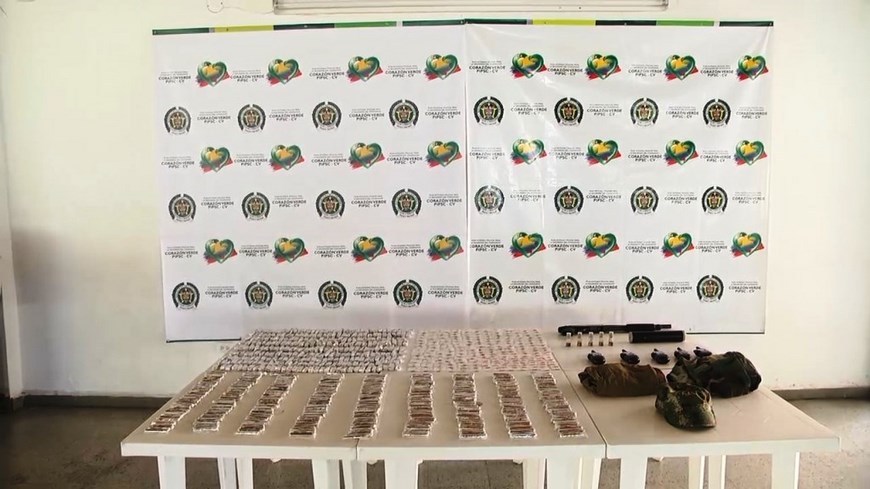 La caleta contenía una escopeta, 5 radios de comunicación, 5 cartuchos calibre 12 milímetros, 1.815 dosis de marihuana, 276 gramos de cocaína y 2.207 gramos de bazuco, entre otros elementos, que fueron incautados.
