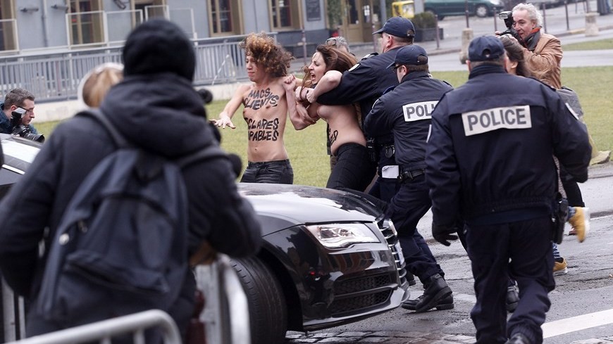 A su llegada al tribunal por la mañana, tres activistas de Femen a pecho descubierto y con inscripciones en el cuerpo, se abalanzaron sobre el coche del ex director gerente del FMI lanzando gritos de condena contra los clientes de prostitutas y los proxenetas. EFE