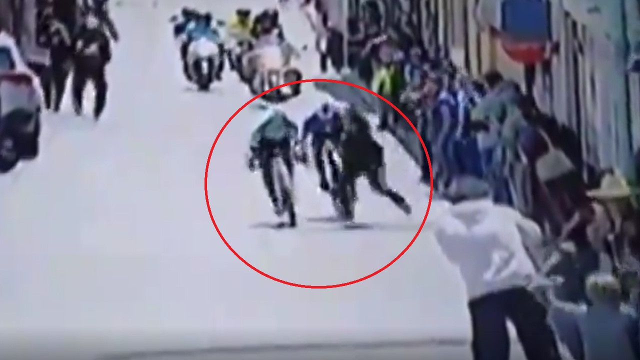 Cuando se desarrollaba la segunda etapa de la Vuelta Ciclística Bantrab a Guatemala, una mujer provocó un accidente en plena competencia. Foto: Tomada de video
