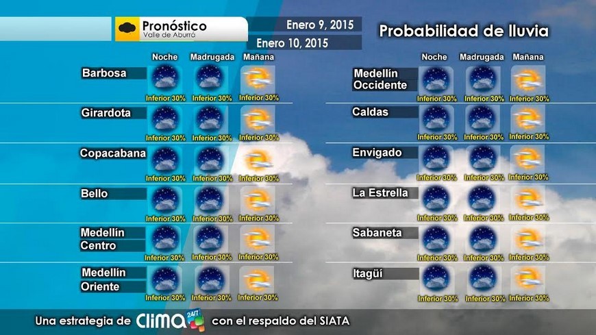El Sistema de Alerta Temprana indica que la probabilidad de lluvias para el Valle de Aburrá en horas de la noche y para el transcurso del 10 de enero en horas de la mañana, tarde y noche es inferior al 30%.