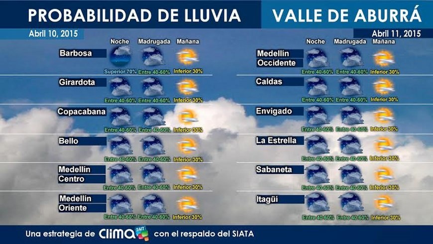 Minuto30.com .- El pronóstico del Tiempo 24/7 para Medellín y el Area Metropolitana, para la mañana del sábado 11 de abril se espera una probabilidad de lluvias inferior al 30%.