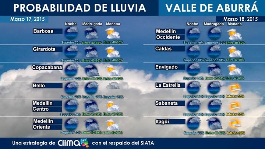 Minuto30.com .- El pronóstico del Tiempo 24/7 para Medellín y el Area Metropolitana, para mañana 18 de marzo de espera probabilidad del 40% al 60% en gran parte del Valle de Aburrá, Bello contaría con una probabilidad de lluvias superior al 70% y la Estrella, Itaguí y Sabaneta tendrían por el contrario una probabilidad inferior al 30%
