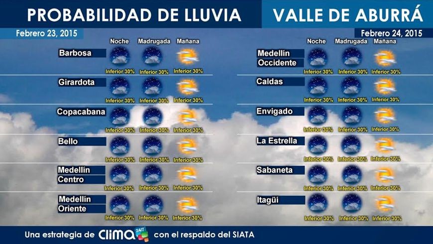 Minuto30.com .- El pronóstico del Tiempo 24/7 para Medellín y el Area Metropolitana, para el día de mañana 24 de febrero se espera probabilidad de lluvias inferior al 30%.
