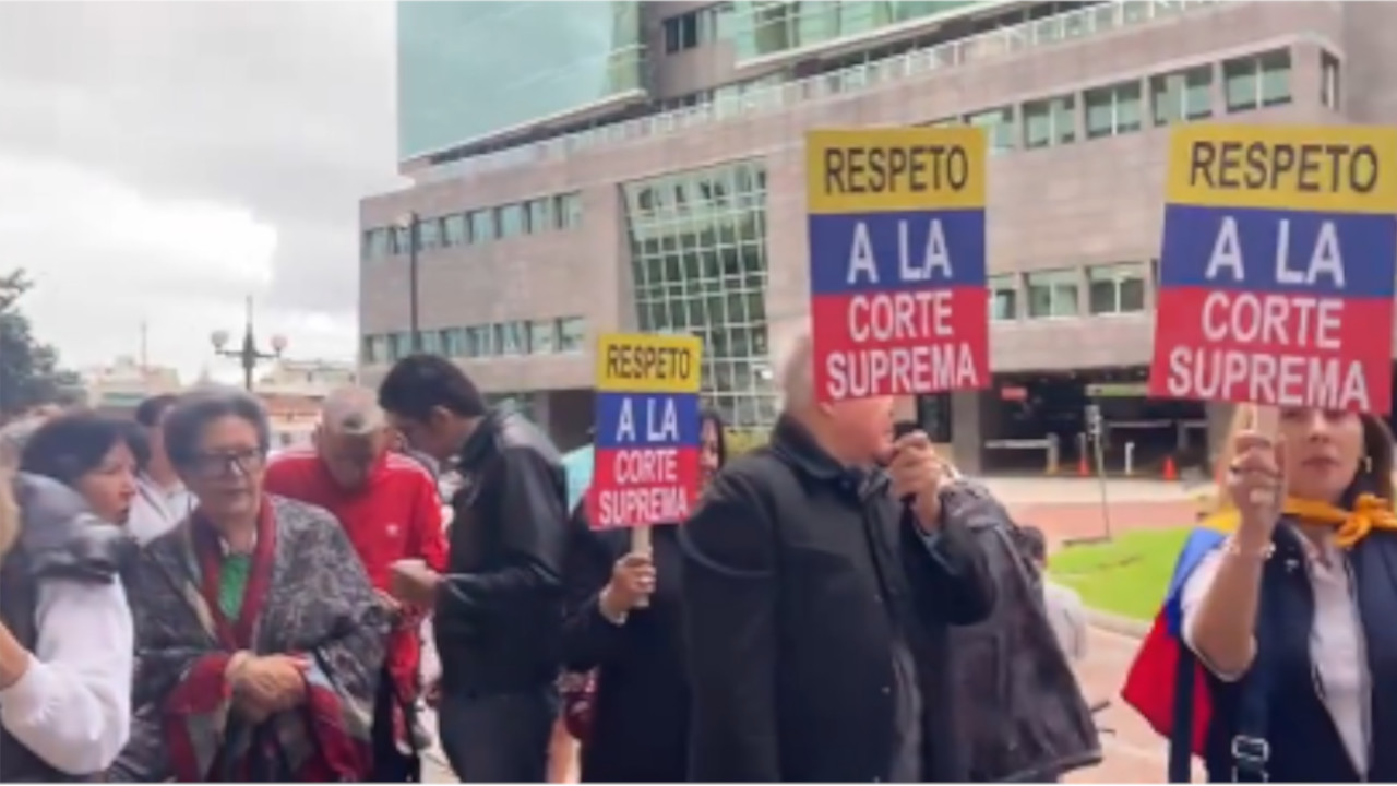 Con pancartas y banderas de Colombia, los manifestantes al frente a la sede de la ONU en Bogotá expresan su respaldo a la Corte Suprema de Justicia.