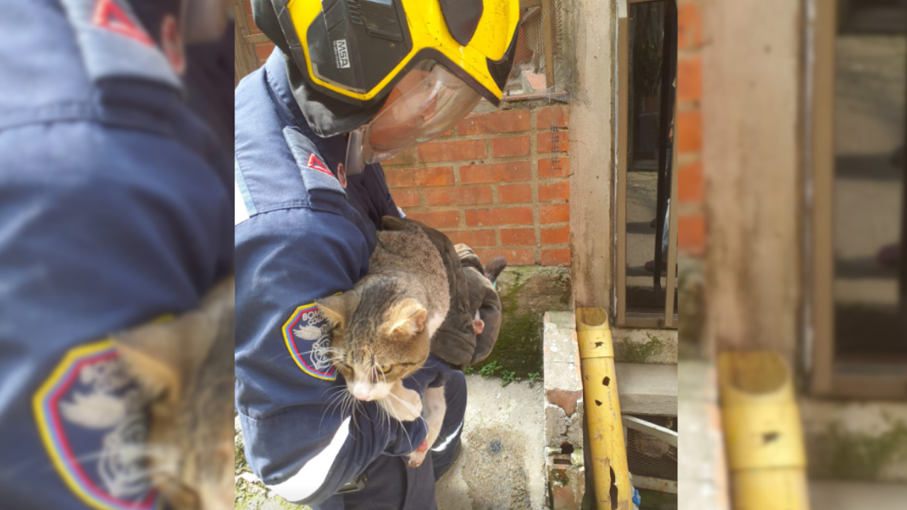 Bomberos de Cali lograron rescatar a un gato que se habría quedado atrapado dentro de dos paredes que separan unas casas en Cali.