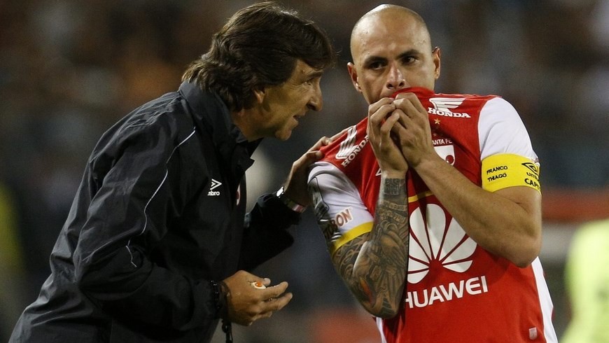 El técnico de Santa Fe, Gustavo Costas, es visto dando instrucciones al jugador Omar Pérez durante el partido correspondiente a la quinta jornada de la primera fase de la Copa Libertadores en el Estadio Monumental en Santiago de Chile (Chile). EFE