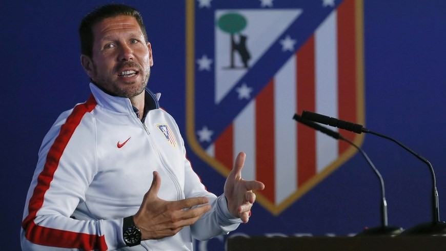 El entrenador del Atlético de Madrid, el argentino Diego Simeone, al inicio de la rueda de prensa que ha ofrecido hoy en el Vicente Calderón, donde el equipo se enfrenta mañana al Real Madrid en partido de ida de cuartos de final de la Liga de Campeones. EFE