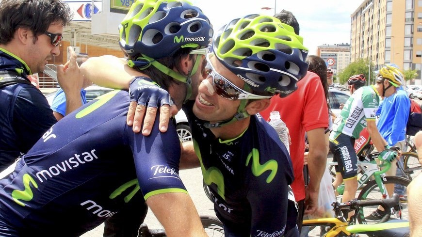 El ciclista Ion Izaguirre (d), del Movistar, se abraza a su compañero de equipo Alejandro Valverde (i). EFE/Archivo