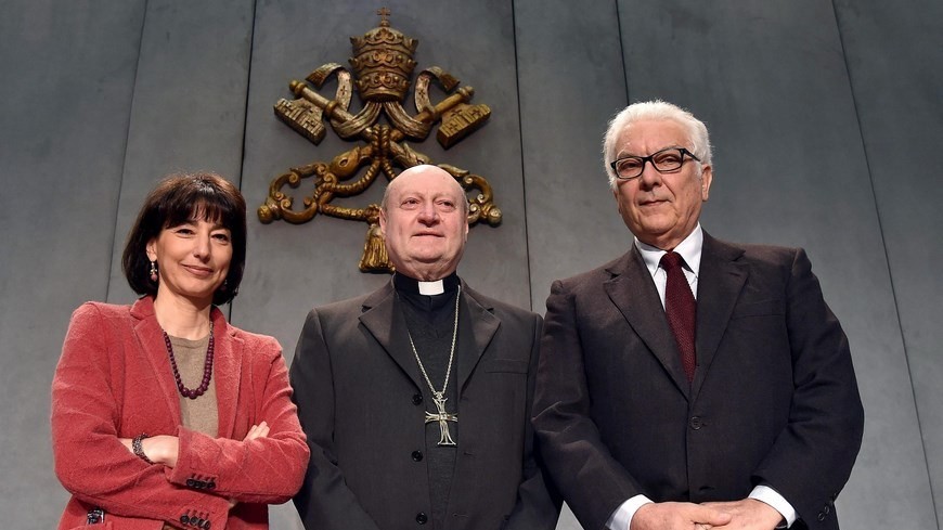 (De izq a der) La directora de la Colección de Arte Contemporáneo de los Museos Vaticanos, Micol Forti; el presidente del Consejo Pontificio para la Cultura, cardenal Gianfranco Ravasi, y el presidente de la Bienal de Venecia de las Artes, Paolo Baratta, posan para los fotógrafos durante una rueda de prensa para anunciar la participación del Vaticano en la 56ª edición de la Bienal de Venecia, hoy en Ciudad del Vaticano. EFE