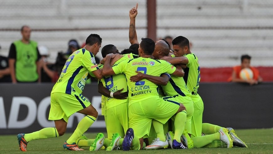Jugadores de Mineros de Venezuela celebran un gol contra Huracán de Argentina el 24 de febrero de 2015, durante un partido de la Copa Libertadores en el estadio de Huracán en Buenos Aires (Argentina). EFE/Archivo