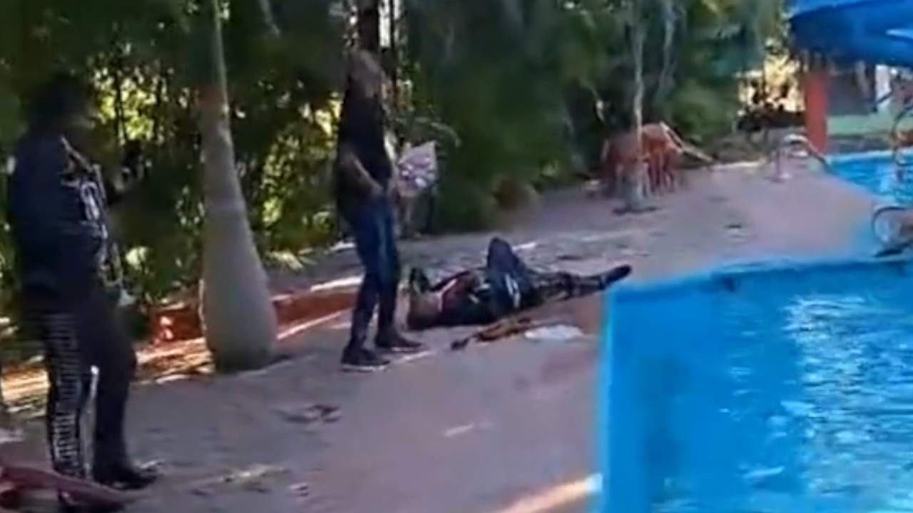 El mariachi rápido salió del agua con ayuda de otro compañero y sólo se quedó acostado en el piso, sin poder para de reir.