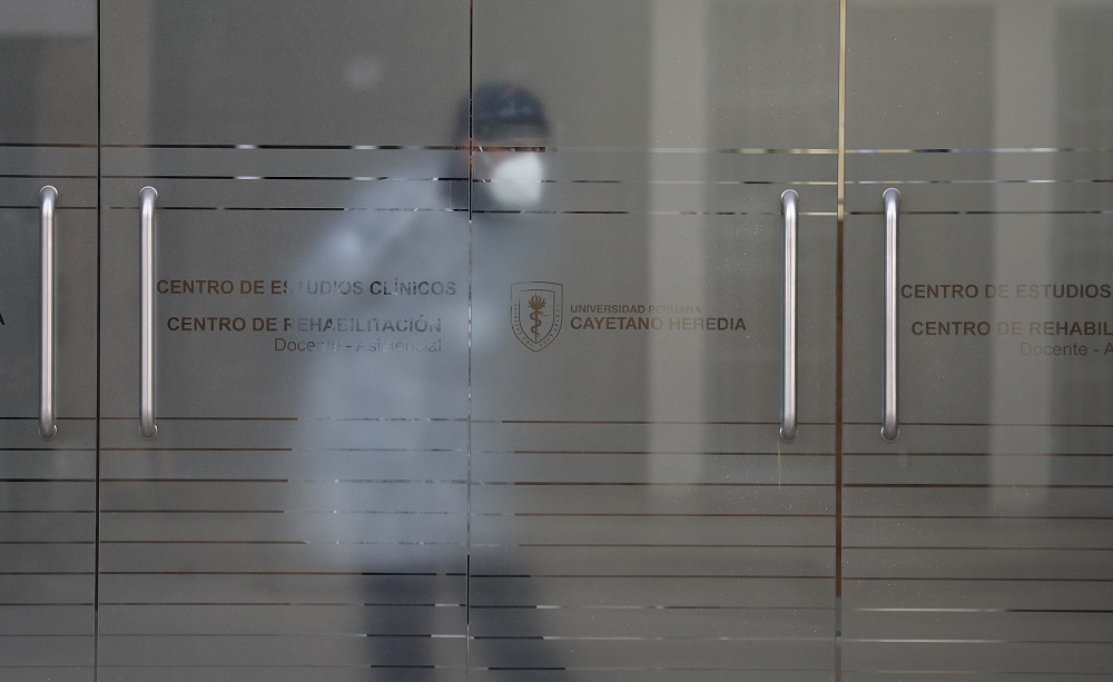 Un persona del servicio sanitario se asoma dentro del Centro de Estudios Clínicos de la Universidad Cayetano Heredia en Lima (Perú). EFE/ Paolo Aguilar/Archivo