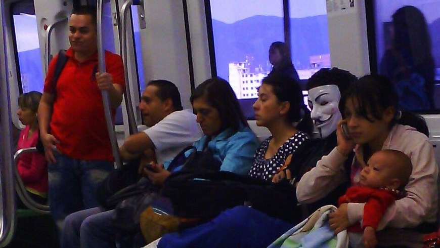 Minuto30.com-. En video quedó registrada la curiosidad que sintieron varios pasajeros del metro cuando uno de los viajeros, que ingresó en la estación Caribe a un tren que se desplazaba en sentido norte – sur, cubrió su rostro con una máscara de ‘Anonymous’ y así siguió su recorrido.
