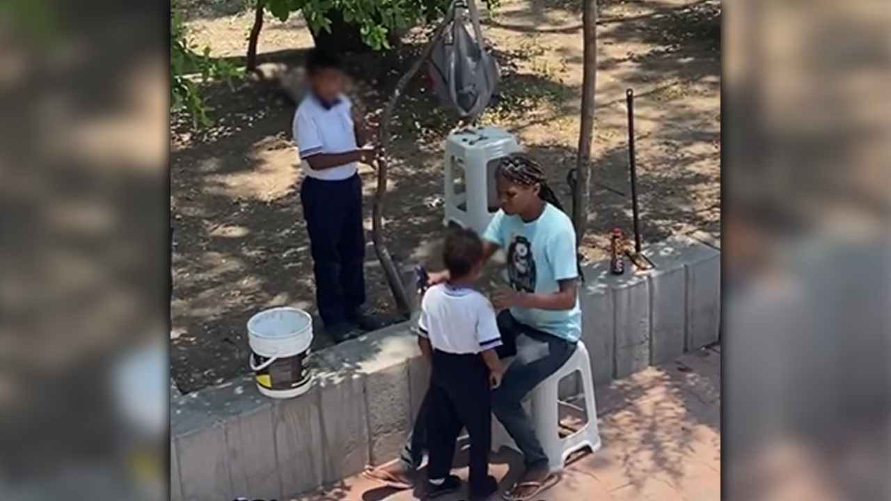 En las imágenes, se puede ver a la mujer arreglando y peinando a uno de sus dos hijos con dedicación, mientras los prepara para ir a la escuela.