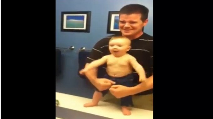 Esta es la situación que se viraliza en las redes sociales pues un bebé de menos de un año admira e imita a su padre ques se ufana frente a un espejo de su fornida musculatura.