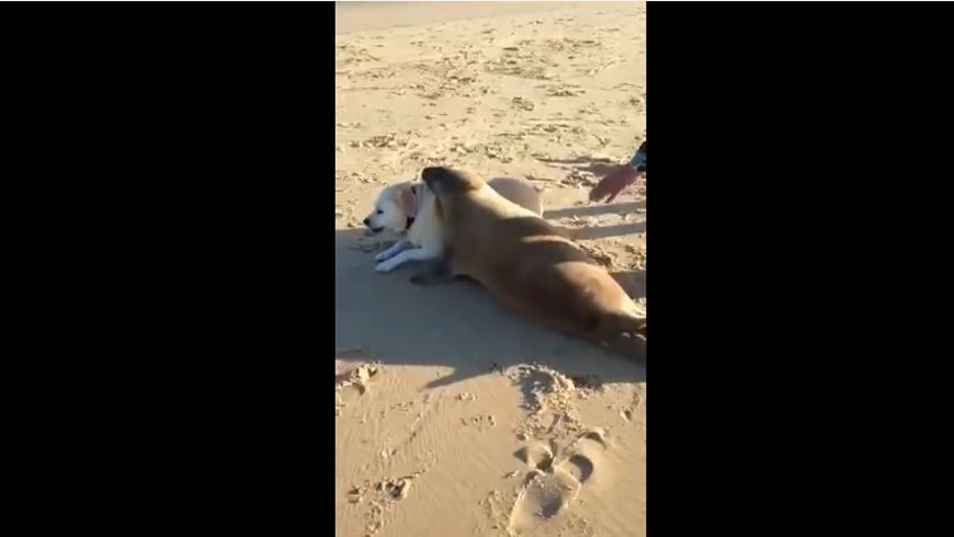 En las imágenes, grabadas este fin de semana en la playa de Cabo Fernet, al suroeste de Francia, muestran a ‘You’, el lobo marino estirándose y moviéndose lentamente sobre la espalda del can.