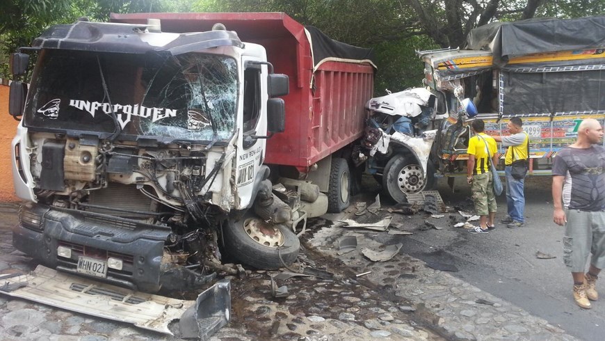El choque ocurrió esta mañana de lunes en inmediaciones del corregimiento Sucre del municipio de Olaya. Según testigos, en el momento en el que una volqueta le daba vía a un chiva, en la carretera apareció otra volqueta que, al parecer, iba sin frenos y cuyó conductor no encontró más opción que chocar contra los vehículos que estaban en la vía.