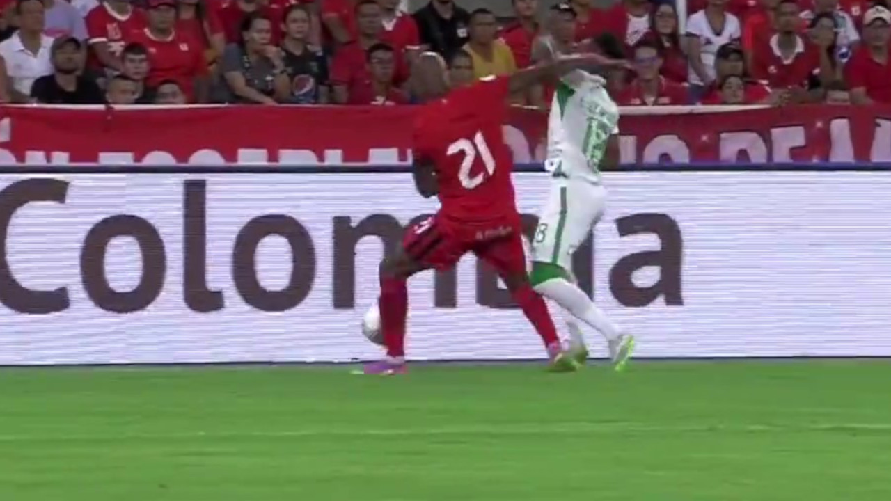 Dos acciones de Edwin Velasco, jugador escarlata, que no fueron sancionadas por el juez, lo pusieron a jugar gratis durante todo el partido de América contra Atlético Nacional / Foto: Tomada de transmisión de Win Sports +