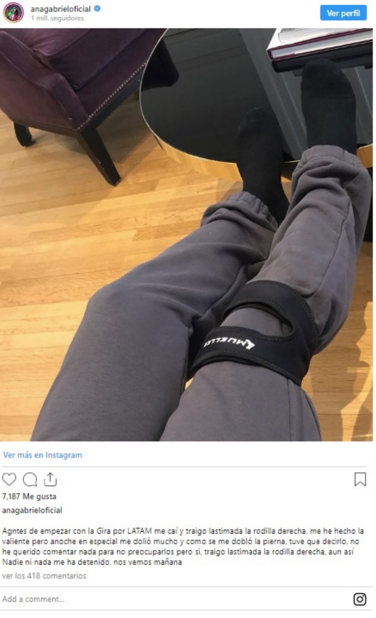 “Antes de empezar con la Gira por LATAM me caí y traigo lastimada la rodilla derecha, me he hecho la valiente pero anoche en especial me dolió mucho y como se me dobló la pierna, tuve que decirlo, no he querido comentar nada para no preocuparlos pero si, traigo lastimada la rodilla derecha, aun así nadie ni nada me ha detenido, nos vemos mañana”, expresó la cantante en una publicación.