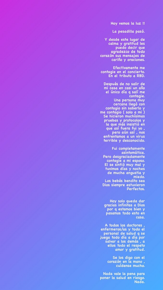 “Después de no salir de mi casa casi un año, el único día que salí me contagie. Una persona muy cercana llegó con contagio sin saberlo y me contagió (sólo a mí). Se hicieron muchas pruebas y protocolos y la que más insistió en que así fuera fui yo, pero aún así nos enfrentamos a un virus terrible y desconocido”, agregó. Anahí fue asintomática.